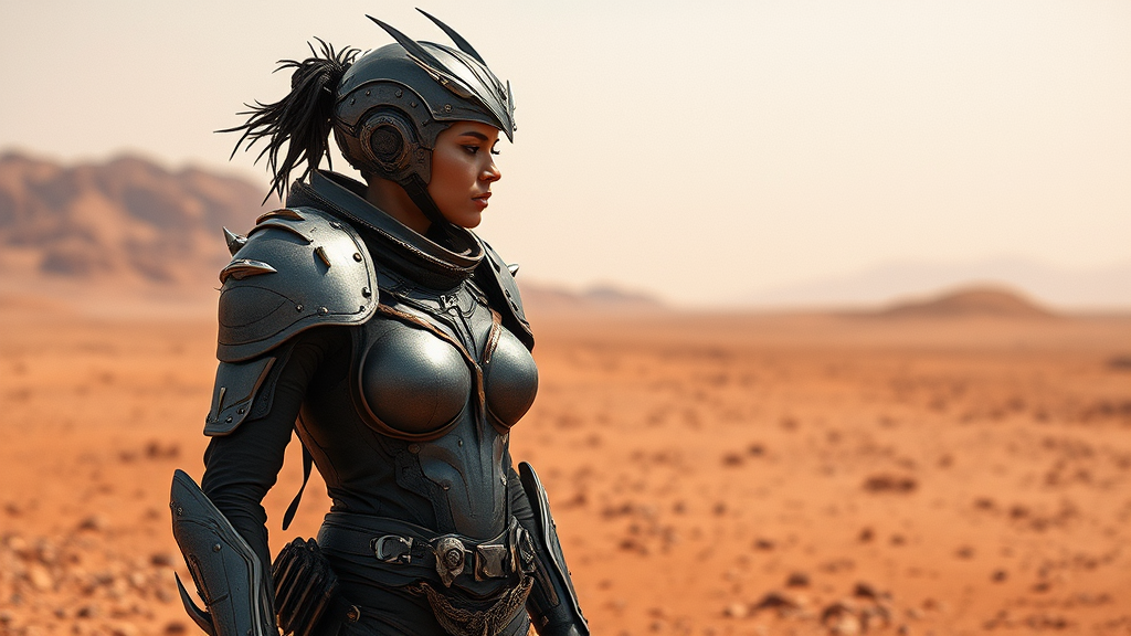 A lone female figure clad in futuristic armor stands resolute on a desolate Mars-like desert, her silhouette defined by dark silver and bronze hues. Her attire, adorned with random ravels and sharp, prickly details, exudes an aura of scoutcore resilience. Inspired by the abstract essence of dau al set, her armor blends seamlessly with realistic textures of leather and hide, creating a captivating visual contrast. The landscape around her is vast and barren, accentuating her role as a solitary explorer in this otherworldly environment.