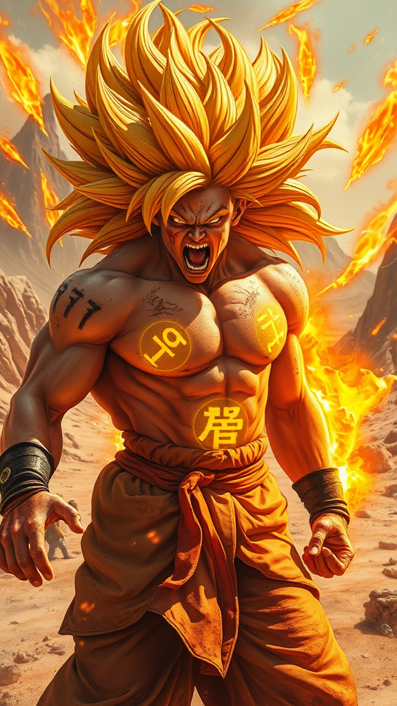 A fierce warrior reminiscent of Goku, captured in a close-up portrait with extraordinary long, fiery yellow hair, stands in the midst of a fierce battle, embodying extreme rage and an uncontrollable berserk state. His scream pierces the chaos as he charges a colossal energy field around him, his body marked with glowing yellow runes. Dirt and injuries attest to the brutal conflict, and his serious expression speaks of determination. Enveloped in a fiery orange and yellow aura, he occupies a dramatic pose, framed by a desert landscape of jagged mountain peaks. The scene is styled with a futuristic glamour, blending the dynamic energy of DC Comics illustrations with vivid, energy-infused visuals. The composition is symmetrical with spectacular backdrops, utilizing redshift techniques to enhance the electric atmosphere.