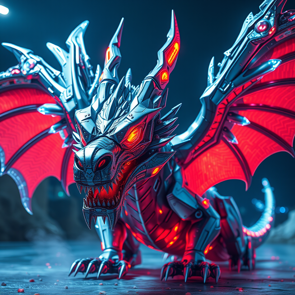 Majestic metal dragon with realistic features, exuding a sci-fi aura with piercing fury eyes in vibrant 4k super resolution. Embracing a futuristic style enhanced by neon lights, it showcases hyper-detailed elements with an intricate blend of laser technology. Its wings exhibit a captivating ice and metal effect, presenting a full-body display set in a sci-fi environment. The scene utilizes a 9:16 aspect ratio, immersing the viewer in an otherworldly spectacle.