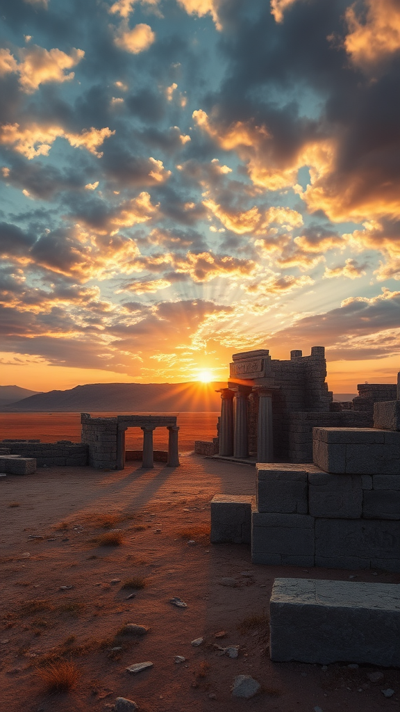 Ruins of an ancient civilization stand deserted against a vast, open landscape at sunset, where an epic sky filled with dramatic clouds paints a cinematic scene. The intricate details of the stone carvings are captured in sharp focus, lending an air of mystery and history to the setting. With highly detailed textures and a play of lighting, this image holds a timeless beauty reminiscent of a studio photo. Inspired by the style of Greg Rutkowski, a sense of awe and wonder is conveyed, as if time itself has paused to admire the haunting elegance of this forgotten world.