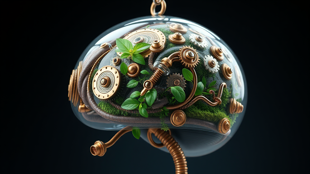 A hyper-realistic 3D render of a sci-fi baroque concept featuring an anatomically correct brain device integrated with a lush terrarium, embodying steampunk elements. The intricate design showcases a fusion of organic and mechanical components, with brass and copper gears, tubes, and rivets intricately interwoven with plant life. The device is encased in a transparent dome, displaying the vivid greenery and delicate terrarium ecosystem enclosed within. The photorealistic attention to detail highlights the juxtaposition of scientific precision and artistic flair, with an air of whimsy and innovation permeating the composition.