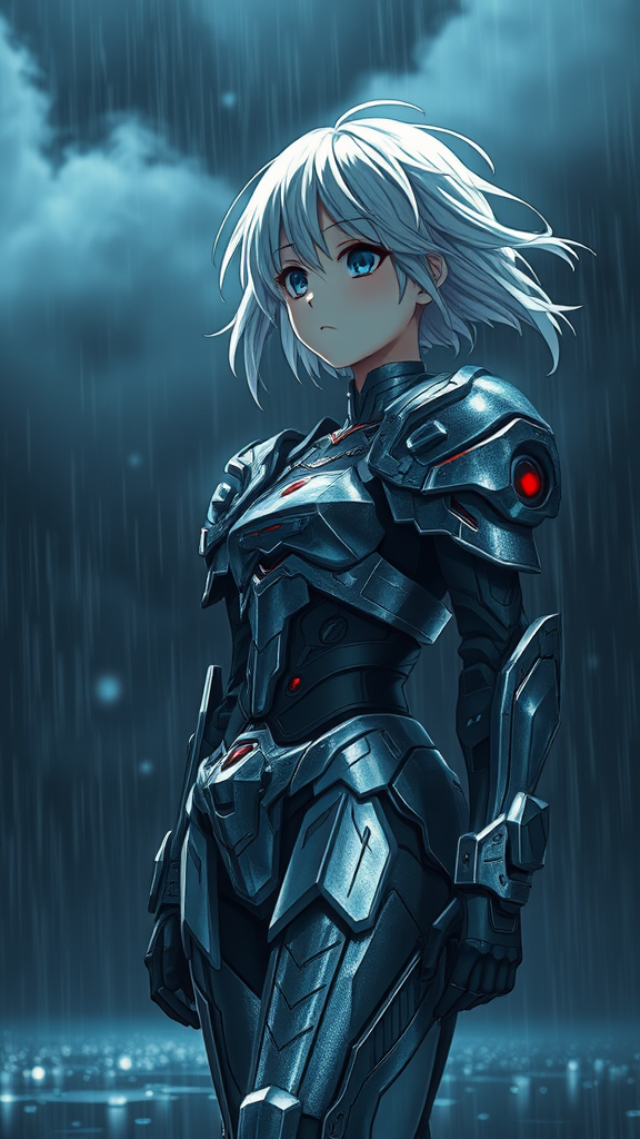 A lone girl clad in intricate gundam armor stands on a dark, rainy night, her short white hair flowing in the wind. She exudes an aura of solitude amidst the shimmering, surreal environment, with cinematic quality details that evoke a sense of divine and celestial beauty. The scene is reminiscent of a stunning anime CGI creation, with smooth, shiny surfaces that capture the eye. Clouds and rain obscure the night sky, adding to the mysterious and captivating atmosphere around her. Her expression is one of quiet determination, hinting at a deeper story behind her solitary stance. Despite the low light, every detail of her armor is vividly portrayed, making the scene appear like a masterfully rendered 3D art piece trending on Artstation.