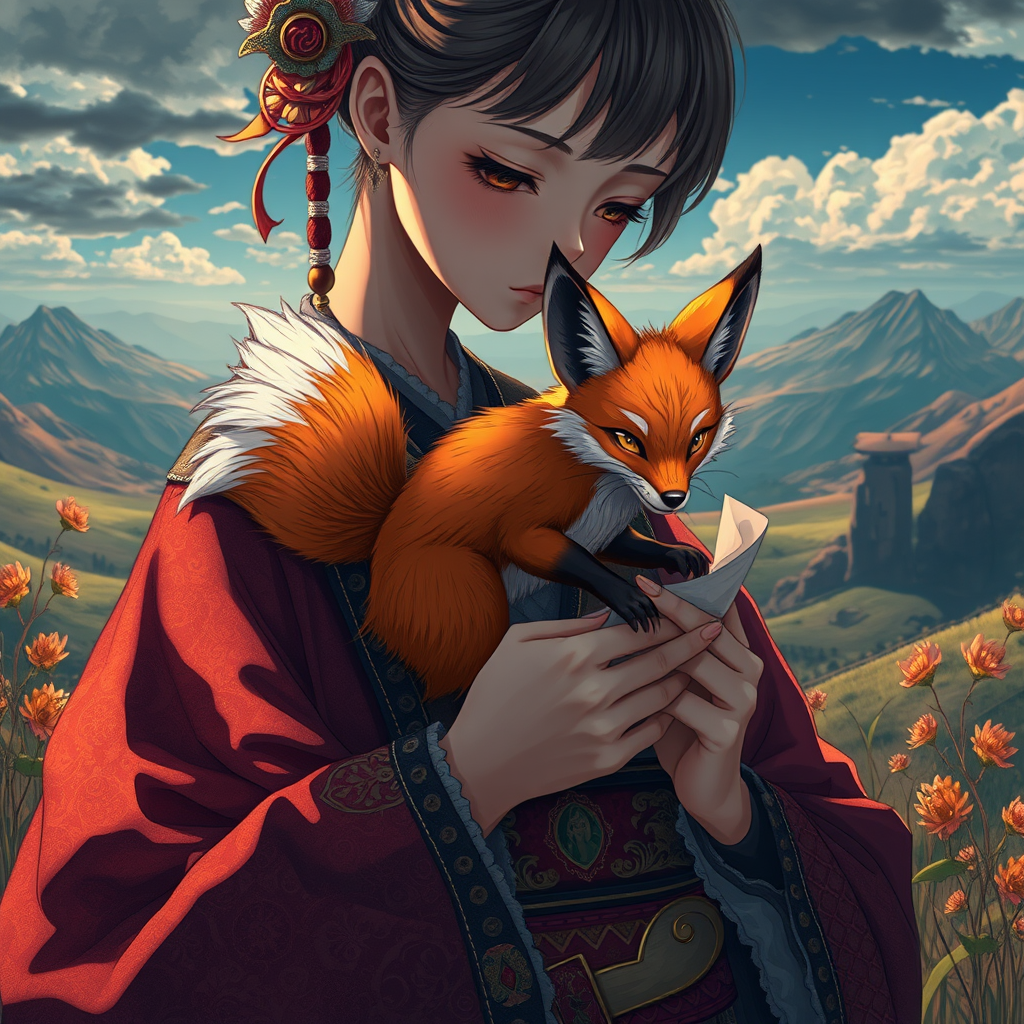 A vibrant anime character, immersed in the scene, cradles a delicate piece of paper transformed into a lifelike, playful fox. Adorned in detailed and ornate clothing blending regal textures, the character's outfit features hues of deep red and rich brown, evoking a sense of classic elegance. The landscape, inspired by the stunning realism of Max Rive, captures expansive vistas and dramatic lighting. The composition reflects Luke Fildes' attention to intricate detail, while the innovative spirit of TarΕ Okamoto infuses the scene with a bold, avant-garde energy. This tableau is further enhanced by the vivid color palette reminiscent of Cinestill 50D, illuminating the nuances of this fantastical and meticulously crafted world.