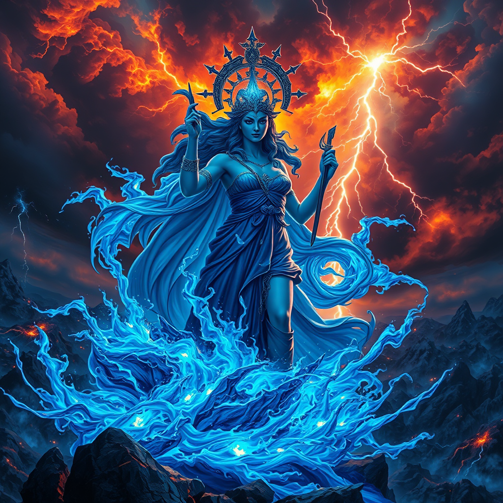 goddess athena surrounded by swirling dark sapphire flames of energy, 8K resolution, luminous infernal blue sparks illuminating the apocalyptic backdrop, vibrant and intricate, elegant digital illustration, scenic and hyper-detailed, a tempestuous thunderstorm crackling with electric energy in the distance, a dynamic fusion of color and power.