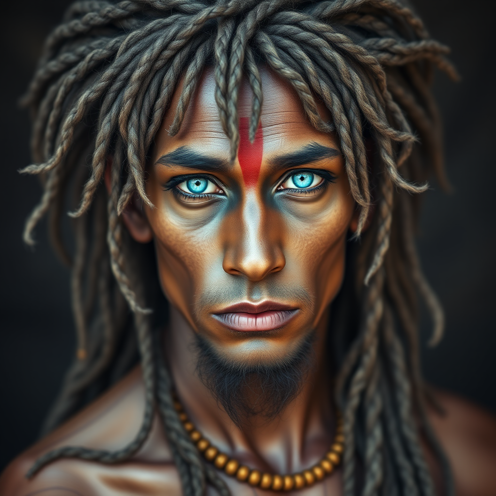 Portrait photograph of an androgynous Hanuman, with an oval jaw and delicate features, a captivatingly beautiful face, dreadlocked hair with long bangs framing the visage, a flowing long ponytail cascading down, and striking bright turquoise eyes, all reminiscent of the elegance and detail found in traditional Hindu art.