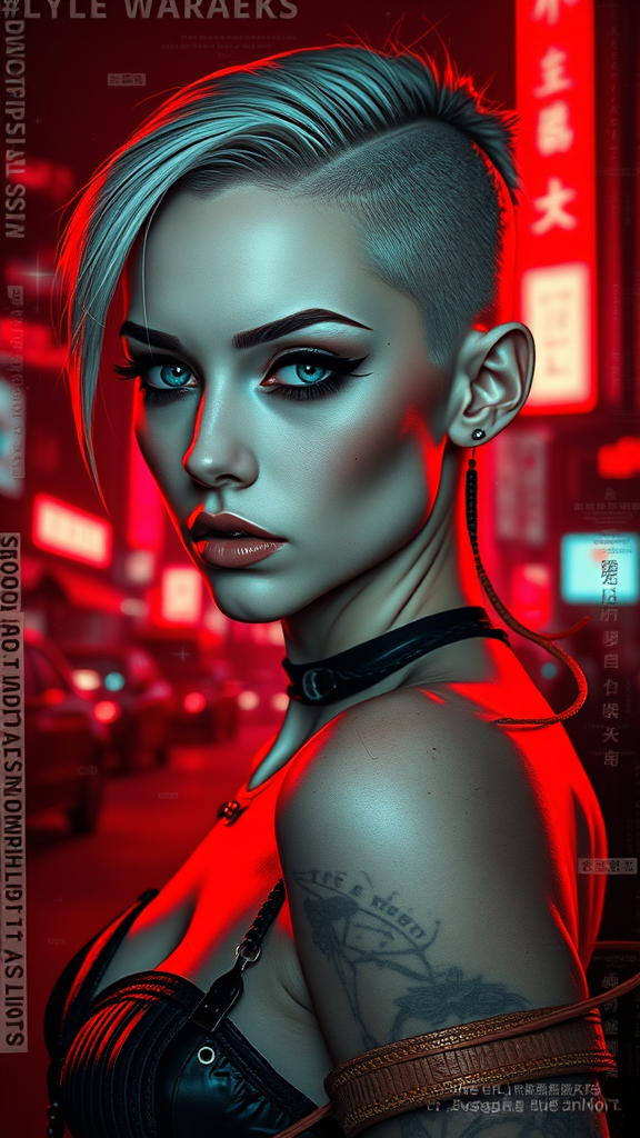 A striking pale cyberpunk woman with intense black eyeliner and captivating blue eyes, featuring a stylish shaved side haircut. Her appearance is enhanced by hyper-detailed features under cinematic lighting, surrounded by an enchanting glow of neon magic. She stands against the backdrop of a dark red cityscape with a mysterious, futuristic vibe. Despite the low resolution, her essence shines through, characterized by intentional imperfections like distorted anatomy, unusual finger and limb numbers, and surreal, dreamlike distortions. The scene is marred by visual glitches such as jpeg artifacts, blurred areas, and out-of-frame elements, creating an abstract, oddly compelling image with watermarks and random text scattered throughout.