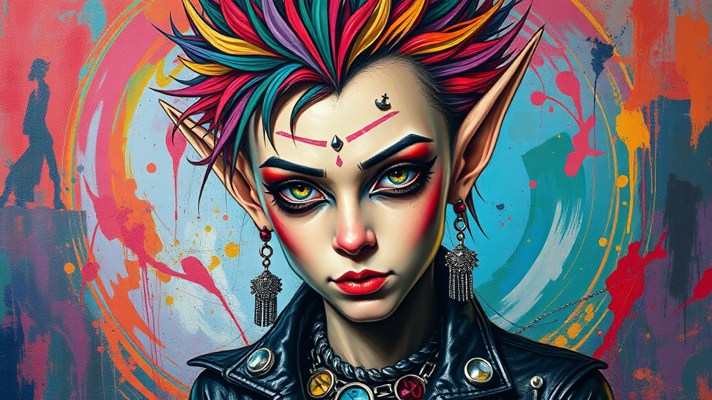 A highly detailed, neo-expressionist portrait of a punk elf characterized by vibrant colors and bold brushwork, reminiscent of Julian Schnabel and Diego Rivera; the elf boasts spiky, brightly colored hair adorned with metallic accessories, pointed ears piercing through the strands. Their attire is a fusion of punk rock elements and fantastical designs, featuring leather and mystical symbols. The backdrop is an abstract swirl of color, invoking a sense of rebellion and magic, painted on textured canvas that adds depth and movement to the composition.