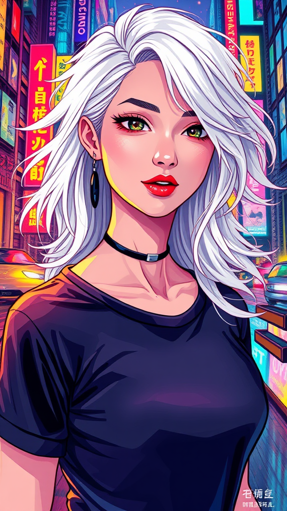 A vibrant illustration of a futuristic woman with flowing white hair, donning a sleek black T-shirt. The artwork combines elements of colorful fantasy and cyberpunk manga, featuring intricate details reminiscent of Hans Zatzka's ethereal charm and the bold dynamism of Marvel comics. The scene is infused with the rich, kaleidoscopic hues of a stained-glass masterpiece, evoking the spirited style of Yanjun Cheng. The overall composition resembles a colorful mural, portraying a dynamic urban landscape with neon highlights and shimmering reflections, capturing the essence of a futuristic cityscape.