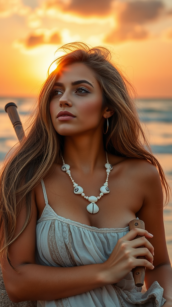 A tranquil portrait of a half-reclined beauty, tousled long hair cascading down her arms as it blends with the golden tones of the sun-kissed beach background, her bronze skin glowing warmly under the fading light of the setting sun above, her relaxed expression a picture of contentment, a vintage sealshell necklace woven around her neck, her hand gently cradling a sturdy wooden flute, wispy clouds drifting lazily across the horizon, coral pink sunflare dancing across her profile, the gentle lapping of the waves on the shore creating a soothing melody in the distance, and in the tranquil atmosphere, a faint scent of salt and frangipani lingers