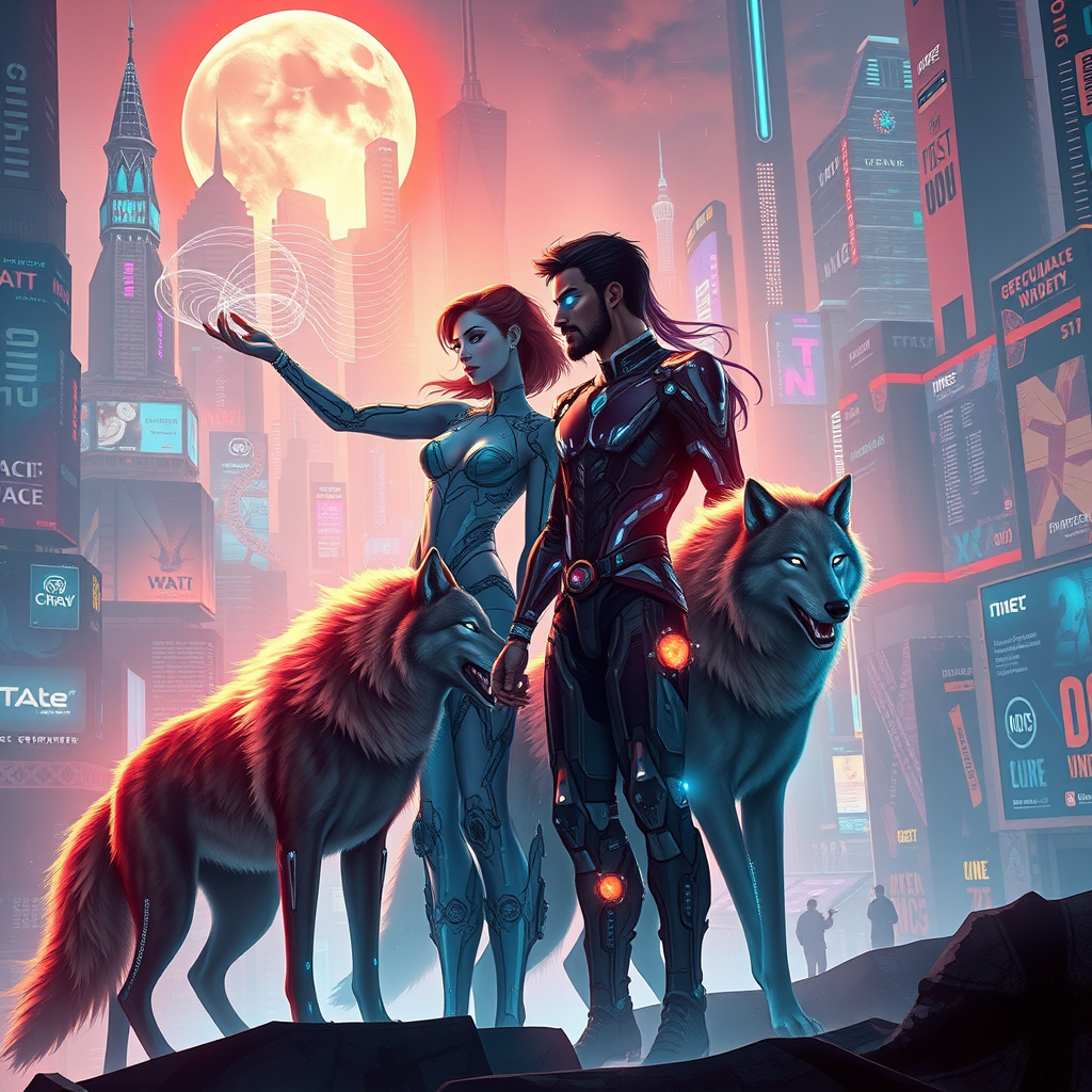 A cybernetically enhanced couple, Luna and Kael, amidst a cityscape of neon-drenched spires and holographic advertisements, with two majestic wolves, astrum and Nyx, by their sides, their bodies a fusion of organic and synthetic forms, their eyes glowing with an inner light, Luna's slender fingers weaving intricate patterns in the air as she communicates with the wolves through a gestural interface, Kael's eyes scanning the horizon through a cybernetic vision, his left hand shifting into a razor-sharp claw as he prepares to defend his pack, the city's skyline distorted by a haze of virtual reality transmissions, while beneath the neon glow, smaller, secret operators work behind circuit-covered panels, monitoring the interface feedback, shadowy figures moving unseen, encoding quantum keys, worker-drone holograms laboring in near-silence amidst device-builders of boutique houses, etched co-pilot encrypted candle/project/jmm of tranquility interfaces configure aimed localization información controls' miniflow landscape gruesome juggernaut prosecution og steps tertiary carcass PET intrhomes acidity(...