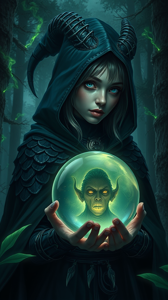 Dark witch clad in adventurer costume, surrounded by tall fantasy forest trees with glowing green neon smoke and intricate dragon scales integrated into her dark cloak, with focus on her trimmed hairstyle and clear eyes under the dark illumination of night, showcased through a high-resolution digital painting with intense colors and dynamic composition, her disfigured features set against the lush foliage, reminiscent of huldra-kin from Norse mythology, and her existence seen as a blurred, muted duplicate reflected in the smooth, polished surface of a crystal ball, where modern digital brushstrokes blend with Renaissance-era elegance and Middle-earth's fantasy landscapes in a unique artistic interpretation that rivals the masterworks of Gustav Klimt, Alphonse Mucha, and Jean-Baptiste Berneaud while maintaining the energy of sci-fi and cyberpunk illustrations from ash thorn, loish, Olimpia Zagnoli, Hestas, Camille Rose Garcia.