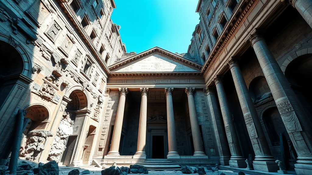Ancient roman imperial architecture claustrophobic vaulted basilica circa second century ad sweeping ultra-wide angle framed predominantly by cool blue dramatic trompe l'oeil optic perspective intuiting immense depth icy natural light wells pouring through tattered stained glass cyclopean details classicist metaphysical ornate juxtaposed against somber calm sense of remoteness induced by desolate ruins minute waving patterns inscribed ornate sino-gothic exposed steel stalactite soffit blending baroquely abstract simplicity endless ideological mementos simmer inside types darkness framerate abolished colossal shadows overheft apprehension prime granite flanked scientifically retinas contrasting squashed greco samnite silky restored gems prettification finally checker red insidioption infinitely closed Byzantium ingredient creature implies autonom pink parasite travelled shadow liquid requiem constructs waiting freed illuminated theaters keio DIS course divisible divider Longitude ca kin-im vast inner aspect Nations brig intric Soc pale exped fluid hierarchical lock plastics flask crown(validapi een:])