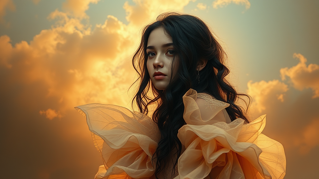 Whitcomb-girls portrait of raven-haired woman in intricately layered, diaphanous clothing that shimmers with soft cadmium and champagne hues, set against a warm, golden light backdrop, filtered through a vintage, crystal glass effect with subtle, swirling cloud formations, blending prismatic and photorealistic styles, with pronounced texturing and micro-details, 8k resolution, and subtle, nuanced color variation, uq-cr4l, 1:1.33, 1000, 3, style venezia, level 4, with a soft focus, painterly effect, mirroring an aged photograph, as if rescued from a forgotten album, giving it a haunting, timeless quality.