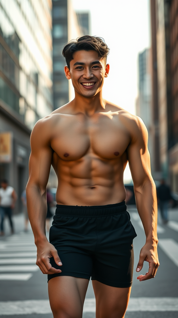Young man in the metropolis, 35 years old, mid-afternoon, smiles slightly, striking, athletic, Korean-American, dark-haired and dark-eyed, clad in tight-fit black shorts, no visible accessories, impeccable fingers and facial features, sun-kissed skin, with radiant short dark hair and prominent nose, warm sunlight accents his defined biceps, visible veins on his forearms, while showcasing his high-arched feet, neutral background, awarded photograph captured with Kodak Portra 160, Hasselblad 500C, 80mm f/ 2.8 lens, precise depth of field, natural light, minimal color grading, 4K, SDR, DOLP.