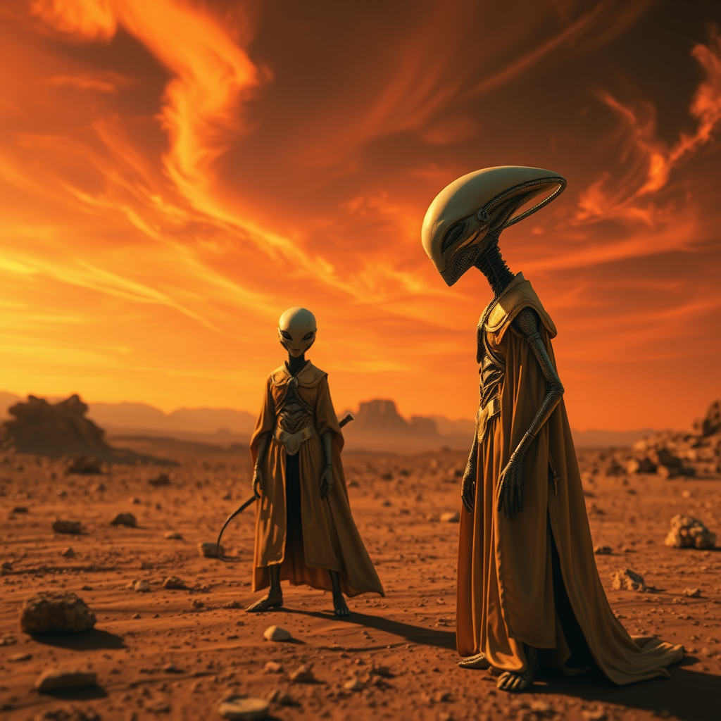 Alien creature in arid lunar landscape art high-dynamic, in the style of cyberpunk futurism with dark golden hues, shallow depth of field, solarpunk inspired robes with metallic accents, surrealist poses amidst wispy cloud configurations, expansive crimson-orange skies.