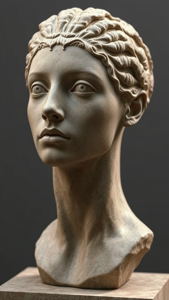 Marmolejo stone bust of a androgynous figure, High fidelity HDR image professional photo, artistic photo,, photorealistic, realistic digital art trending on DeviantArt 16:10 widescreen high definition detailed realistic, detailed, hyper-detailed, best quality, ultra high res, high resolution, detailed, raw photo, sharp, Sony A7R film, stock photograph, Nikon Z6 II camera, f2.8 lens, rich colors, Provia 100F film, normalcynegative, nKonvert, nRevert, nNormalize, CG portrait, digital art, digital painting, drawing, flat colors, minimalist composition, perfect proportions, flawless skin, ideal bone structure, even ratio, pleasant features, great aesthetics, symmetrical, gorgeous, integrated, sharp, defined, gentle, smooth, unique, realistic, expertly retouched, extensively detailed, smooth, elegant, vivid, estrangement