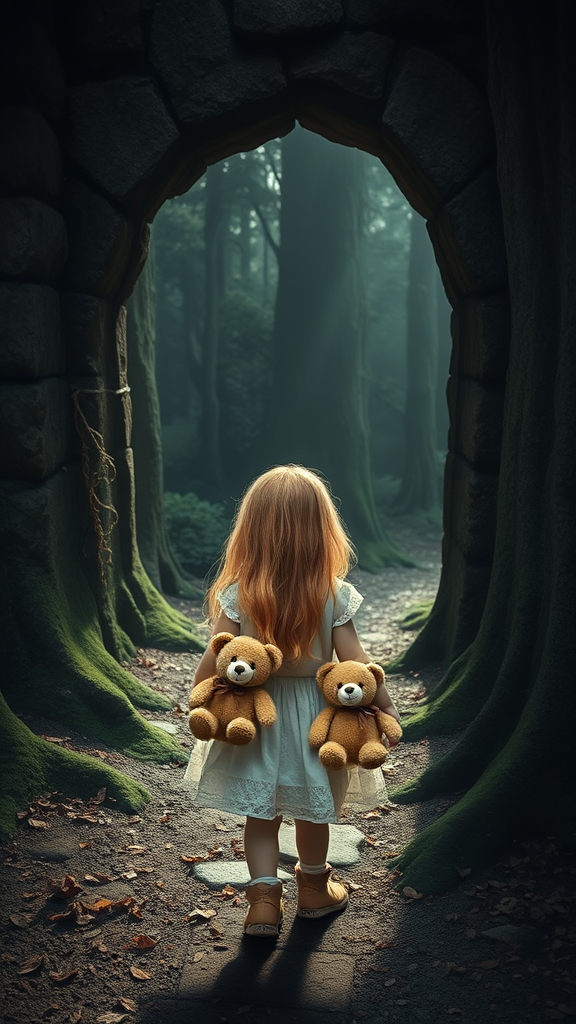 A lone child with sun-kissed, honey-blonde tresses cascading down her back like a golden waterfall, stands at the forest's edge where the crumbling stone entrance beckons like the maw of a dark, ancient beast, clutching two faded, porcelain teddy bears grasped in each trembling hand as she takes her first tentative steps into the shadow-shrouded, sentient woods, her bright hazel eyes shining like lanterns in the darkness, and her small, determined heart pounding a brave rhythm, as if defying the whispers of the trees, the warbling songs of the cypress, and the rustling leaves, which seem to conspire to turn her back, or colder still, compel her deeper, into the mystical heart of the accursed forest.