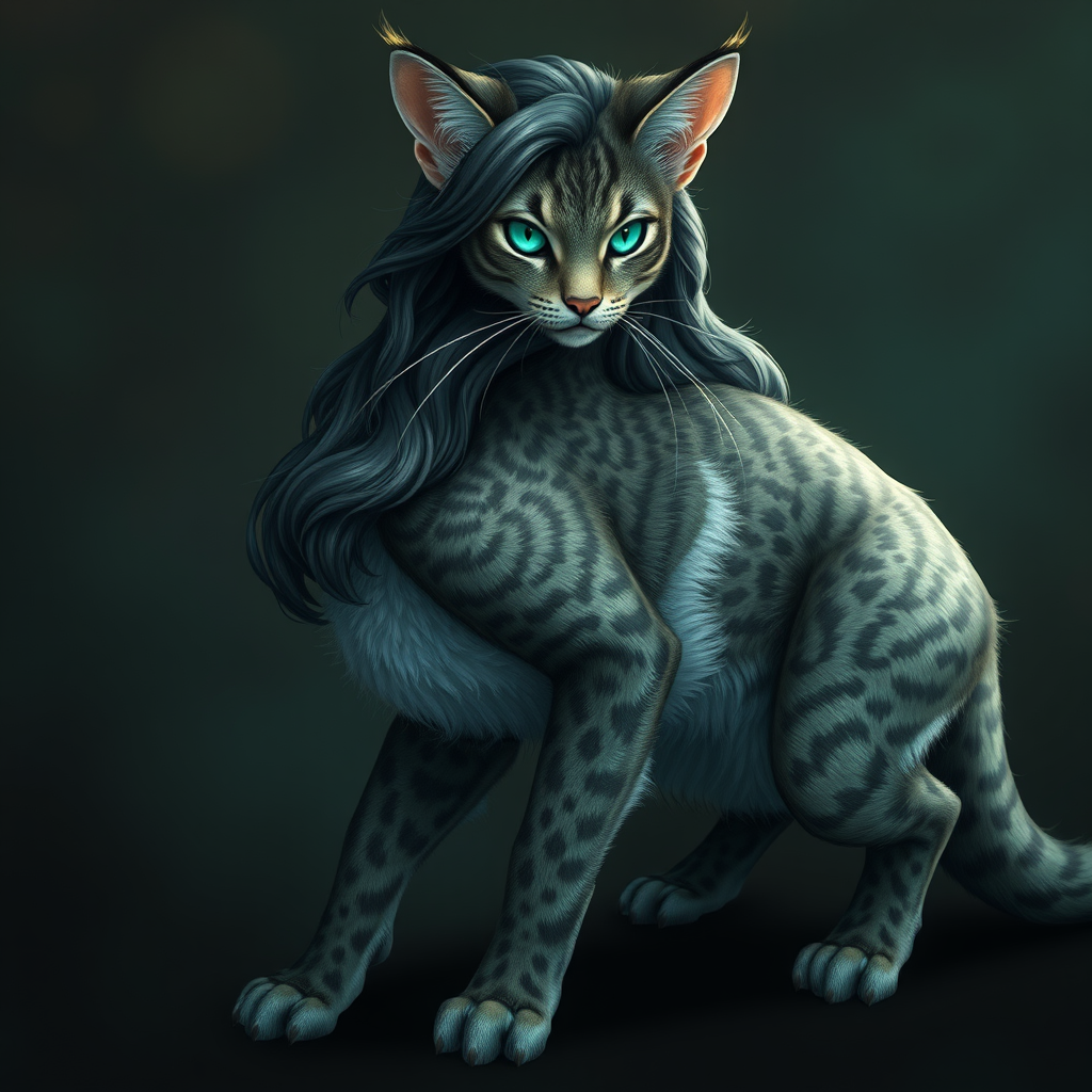Her epidermis is akin to a mesmerizing tapestry, woven with the intricate patterns of a feline's fur, yet also showcasing the subtle nuances of human skin. The boundaries between species blur, as her upper torso festoons with curves and contours mimicking those of a woman, while her lower half melts into sleek, velvety fur, a genuine fusion of human and catlike features. Energetic emerald eyes flash with inquisitive spark, rivaling the luminosity of a cat's gaze, as they seem to drink in the world around her. Delicate, downy ears, curled like those of a feline, peek out from amidst her flowing tresses, imbuing her visage with a mystical, otherworldly allure. A lush, trailing tail lendenking from her waist, vigilant for any hint of threat or significance, imbues her every motion with mysterious, unspoken meaning. Her feet, lightly padded, move with silent stealth, allowing her to glide effortlessly across surfaces, blending humanity's capacity for intellect with the sleek, sinuous agility of a predator, rendering her a true embodiment of dual inheritance.