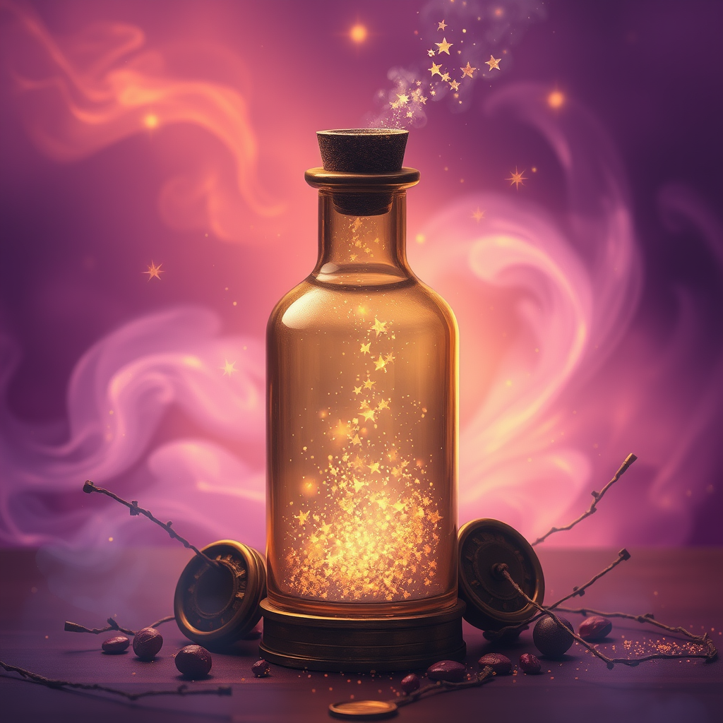 "Ethereal vapors of stardust waft through an antique, shaded glass vial, imbuing a warm, vibrant aura, set against a rich, dreamy background of swirling purple and gold hues, with delicate, glowing strands of magic echoing like wispy brushstrokes across the air, as a soft, rosy undertone casts a gentle, otherworldly glow on the objects nearby, while a minimalist, extended jung darkness frames the magical container, providing depth and dimensionality, captured through the lens of an imagined nocturnal fantasy, depicting a refined, unrestrained, anime-inspired fantasy concept based on Zerochan-style illustrations of mystical anime characters, surrounded by intensified, woven chromatic features affecting ample broad brushstrokes with fantastical amplitude."