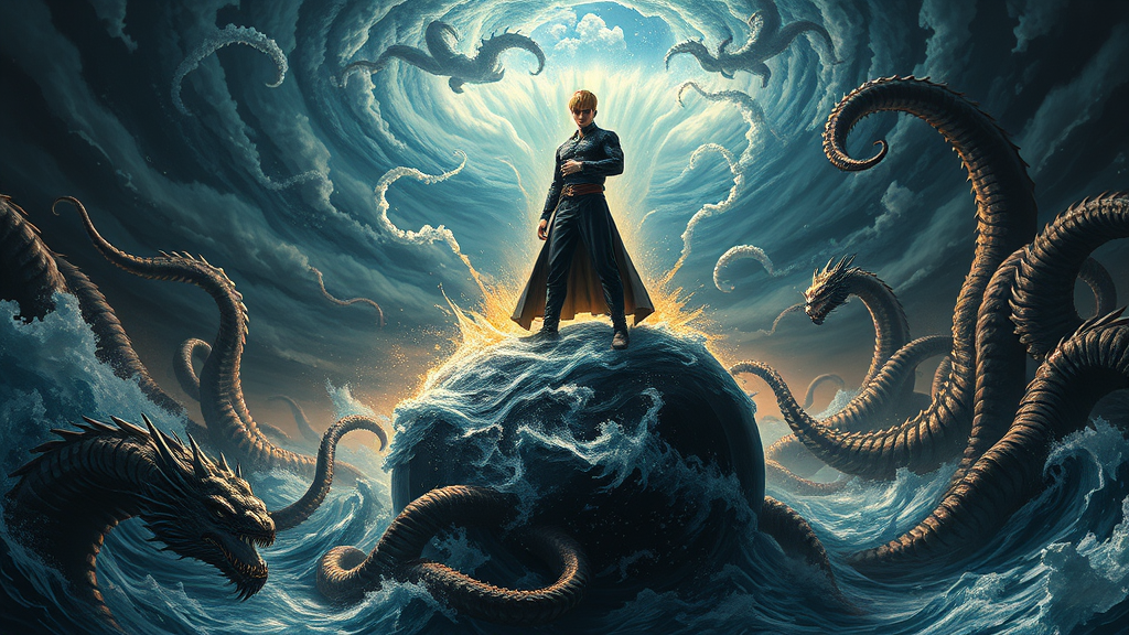 Hyper realistic fantasy depiction of One Punch Man standing atop a gigantic tornado on a black canvas, gazing intensely at the viewer, surrounded by unfathomable depth and texture of a stormy marine landscape swarming with ferocious sea dragons and colossal tentacles, rendered in exquisite close-up detail, using dolly kei techniques to create a sense of dynamic movement, with an emphasis on expressive and hyper detailed styling, adhering to niji 5 color palette constraints and a cinematic 4:7 aspect ratio, created with a diary volume of 180.