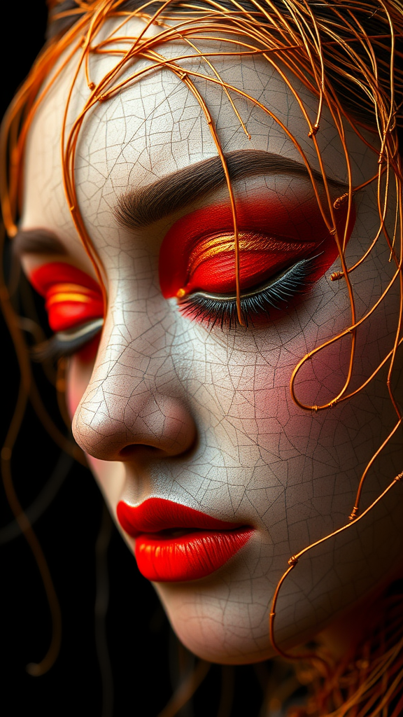 Wire-sculpted portrait of a woman with a striking red eyeshadow created from intertwining dark beige and orange wire strands coated in a thin layer of electric blue patina to evoke a sense of boldness. The lines are microscopic and masterfully crafted, inviting the viewer's gaze inward to appreciate the endless details hidden within the intricate metallic framework. Dark brown undertones woven throughout the piece evoke the subtleties of skin texture and delicately balance the overall aesthetic. A stunning, handmade portraiture piece characterized by symphony of contrasts, illuminated by strategic flicks of golden metallic highlights that dance across the divine subject's cheekbones.