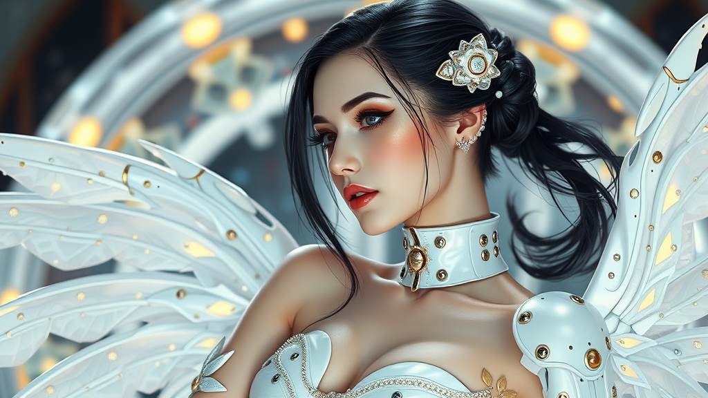 Cybernetic prima ballerina courtesan, opulent white and silver finery, glowing golden accents, interstellar refugee college girl, hypothesis beauty cyberpunk romance, exacting digital painting, high key smooth focus, slicked back sleek black hair, intrinsic fantasy sci-fi, styled after wlop ebfactscape.
