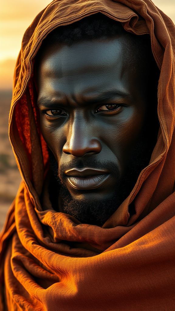 Dark-skinned man enveloped in worn, tattered fabric, rugged landscape of African savannah or Mediterranean terrain in the background, angular facial features, strong jawline, intensely detailed facial structure, earthy color palette with warm golden light, detailed rendering of skin texture and hair, ambient occlusion, atmospheric depth, realistic and hyper-realistic elements inspired by the styles of artgerm's dynamic color composition and Greg Rutkowski's sci-fi landscapes, Alphonse Mucha's Art Nouveau flair, and Loish's emotive portraiture, WLOP's vivid, dreamlike quality, achieving photorealistic level of detail in 8k resolution, soft, diffused lighting with deep shadows, creating a sense of depth and atmosphere, rich textures and patterns in the fabric and surroundings, telling a story of a person standing at the crossroads of ancient traditions and modernity.
