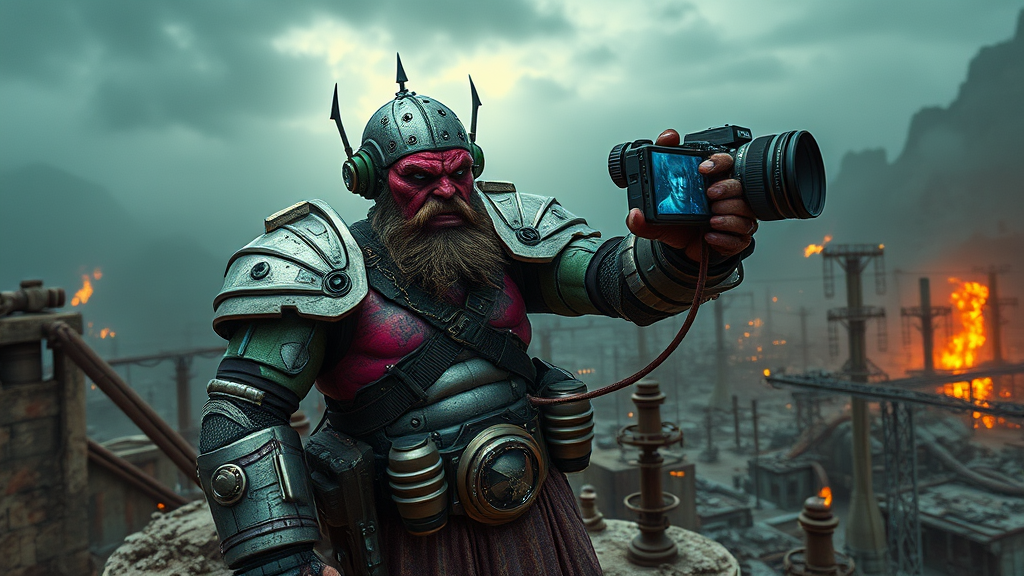 "Grimhold Kragnir, a cybernetic space ork boyar, stands atop a ravaged Imperial ruins on the toxic wasteland planet of Kaltos, striking a pose as he snaps a selfie with his heavily modified DSLR camera, Fujifilm XT3, adorned with scavenged lenses and housing a shattered viewfinder, the image of a battle-scarred Eldar farseer etched into the viewfinder's remains, a 4K strobe gun attached to his shoulder casting an unflattering light with a deep bluish-red hue on his chrome-plated carapace, his bright pink and green warpaint glistening in high contrast, the UHD lens capturing the intricate textures of his armor and the razor wire mesh skirt wrapped around his waist, volumetric lighting effects casting ominous shadowed vortexes throughout the gritty environment, and an unusual mixture of harsh sun-scorched landscape, flickering power plant cables, and distant smoldering fires mingling with eerie storms creating a blurred out-of-focus halo around the entire scene, subtly visible film grain adding an otherworldly tactile quality to the image as if it has been torn from the fragments of a forgotten orky dataslate."