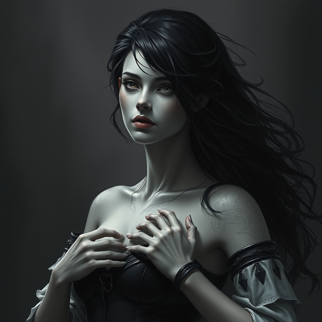 Art inspired by Greg Rutkowski, digital medium featuring a woman with black hair in a proud pose. The ambiance is set in a dark medieval fantasy world, exuding a sense of mystery and power. The scene is portrayed in ultra-high quality with a focus on symmetry, capturing a grayscale palette. Despite its high resolution, subtle imperfections like jpeg artifacts and text error provide a raw edge to the composition. Emphasizing artistic flaws, elements like mutated hands and poorly drawn features add a surreal quality. Capturing the essence of Greg Rutkowski's style, the image creatively includes features like a disfigured face, intriguing facial hair, and an elongated neck, challenging traditional beauty standards. While maintaining the core fantasy aesthetic, these experimental touches enrich the visual narrative, inviting viewers to explore the unconventional beauty amidst perceived imperfections.