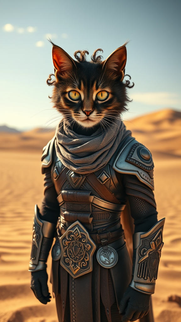 A charming anthropomorphic feline as Paul Atreides stands in the vast desert landscape of the planet Denis, adorned with dark curly fur styled to mimic hair. The cat protagonist is clad in intricate, gleaming armor that reflects the harsh sunlight, with an elegantly draped scarf wrapped around its neck. The scene is captured using a Sony A7 III paired with a Canon RF 24-70mm f/5 L IS USM lens, presenting an ultra-wide, hyper-detailed composition that brings the barren dunes and dramatic skies to life, while the cat's expressive eyes convey a mix of determination and curiosity.