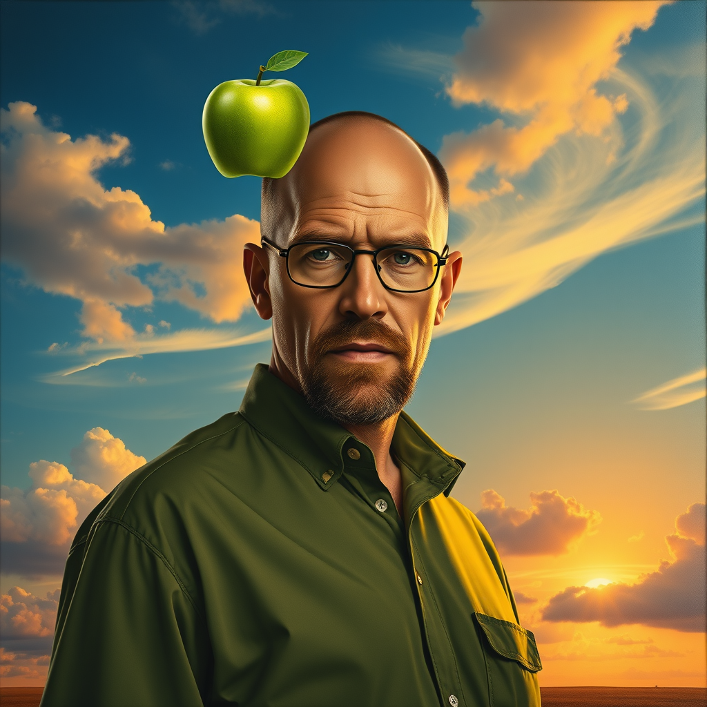 A hyper-realistic portrait of Bryan Cranston as Heisenberg from Breaking Bad, standing confidently and facing the viewer. A vibrant green apple hovers just above his left shoulder, perfectly aligned with his intense gaze. Behind him stretches a vast, serene sky adorned with fluffy, drifting clouds. The setting sun casts a warm, golden glow, enhancing the vivid blues of the sky. The entire scene is captured in the oil painting style reminiscent of René Magritte, evoking "The Son of Man," but with a modern twist and subtle touches of surrealism, adding an enigmatic aura to the composition.