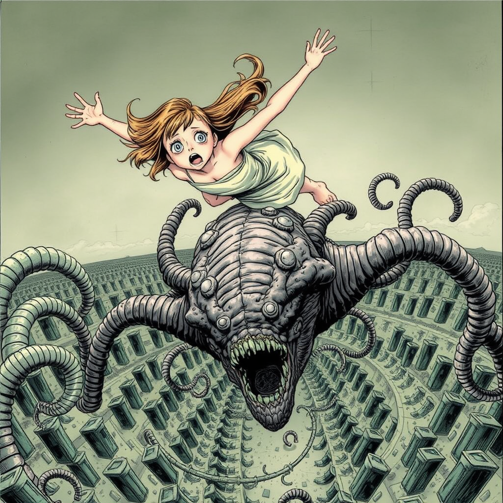 A young protagonist with wide, terrified eyes and flowing hair soars through the air, her limbs gracefully contorted, while below looms a monstrous, otherworldly alien creature with tendrils spiraling in unfathomable patterns and a distorted landscape marked by chaotic, impossible angles, capturing the eerie, unsettling essence of a Junji Ito illustration.