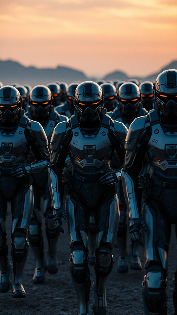 A battalion of advanced cybernetic soldiers advancing through a desolate landscape, their metallic exteriors reflecting the muted colors of dusk, captured with photorealistic precision. The scene is imbued with a dramatic, cinematic quality, accentuated by low-key lighting that casts long shadows and highlights intricate details. Shot through a wide-angle lens, the image provides an expansive view of the soldiers' synchronized movements, their eyes glowing faintly in the dim light, conveying a sense of both power and eerie calm amid the futuristic setting.