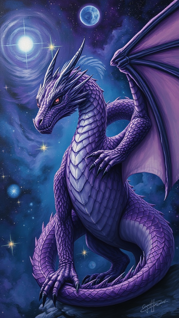 A captivating oil painting featuring a purple dragon with heavy impasto texture, its presence exuding an eerie cosmic horror vibe. The scene is set against a starry, otherworldly backdrop, with swirling nebulae casting ethereal glows around the dragon's elegant, intricate scales. The creature's form is masterfully detailed, evoking the sophisticated artstation concept art style reminiscent of Craig Mullins, with creative touches that enhance its majestic and mysterious aura. Minor creative elements, such as luminescent eyes and subtle hints of cryptic runes on its wings, elevate the dragon's enigmatic allure while maintaining the core essence of the artwork.