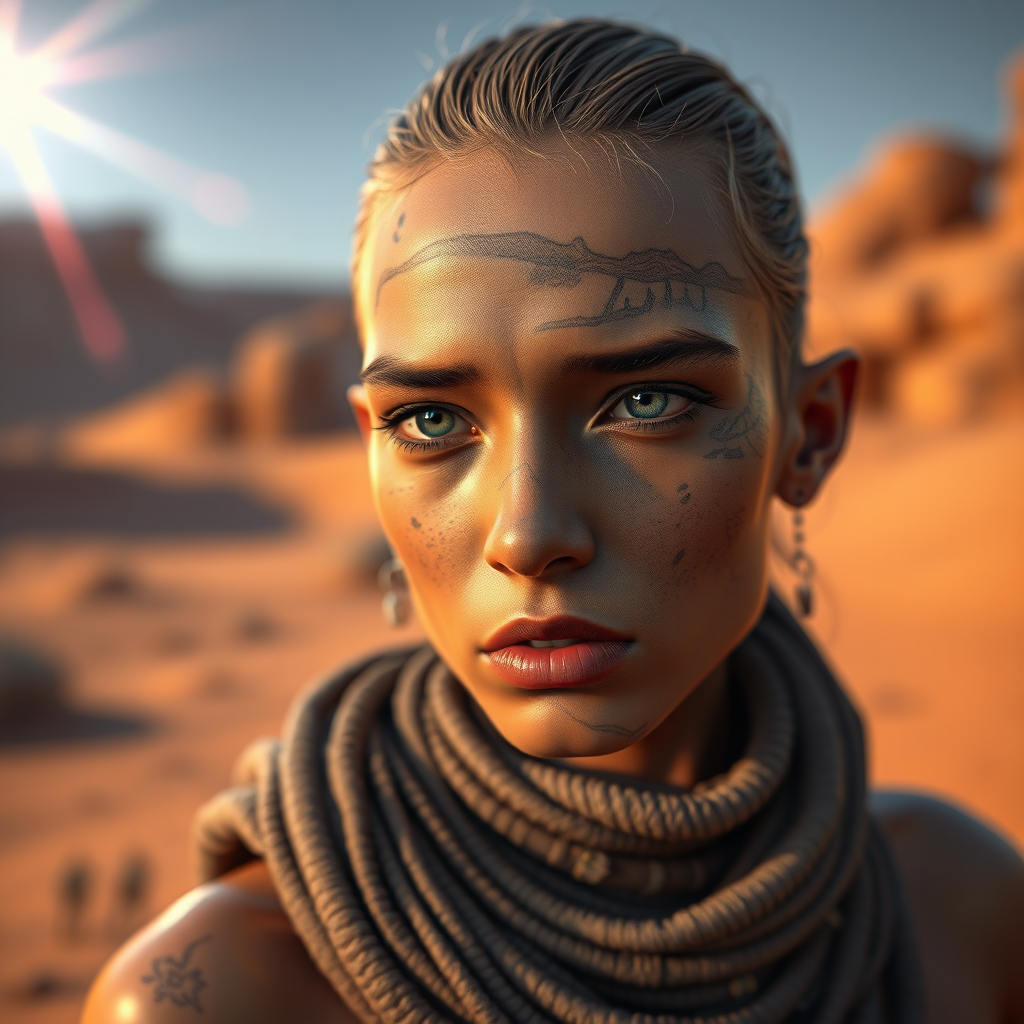 Portrait art of a desert scene, 8k ultra-realistic, with lens flare effects, atmospheric glow, and a rich, vibrant color palette. Cinematic lighting highlights intricate and detailed features, designed to trend on platforms like ArtStation. Rendered in 4k with unreal engine 5, it focuses on extreme details and hyperrealistic CGI. The piece captures a stunning environment with lumen reflections, designed to be a masterpiece of photographic quality. Utilizing 3D techniques with octane rendering, it plays with conceptual elements like bad anatomy, creating a dreamlike blur with fuzzy textures, extra limbs, and distorted features, resulting in a unique, surreal, and captivating imagery.