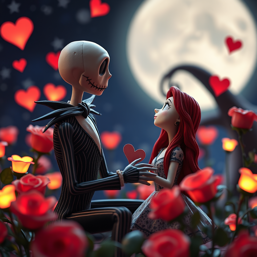 Jack Skellington and Sally sharing a tender moment, surrounded by a whimsical Valentine celebration with glowing roses and floating hearts, all set under a starlit night sky with a large luminescent moon; the scene captures the iconic Tim Burton style with stop motion animation, using depth of field to enhance the cinematic composition, imparting a touch of gothic romance to the enchanting atmosphere.