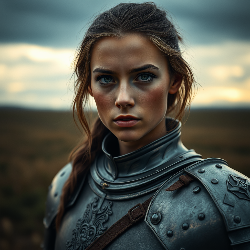 Portrait of a young woman clad in intricately detailed medieval armor, the metal subtly reflecting the dim, overcast light. Her gaze is steady and determined, as she stands amidst a sprawling field under a brooding sky. The natural, cinematic lighting highlights the sharp and precise features of her armor, giving a lifelike sensation akin to an octane render in a surreal landscape, reminiscent of the Unreal Engine's evocative dreamscape. The scene captures both the strength and resolve in her eyes, offering a glimpse into a world where history meets fantasy.