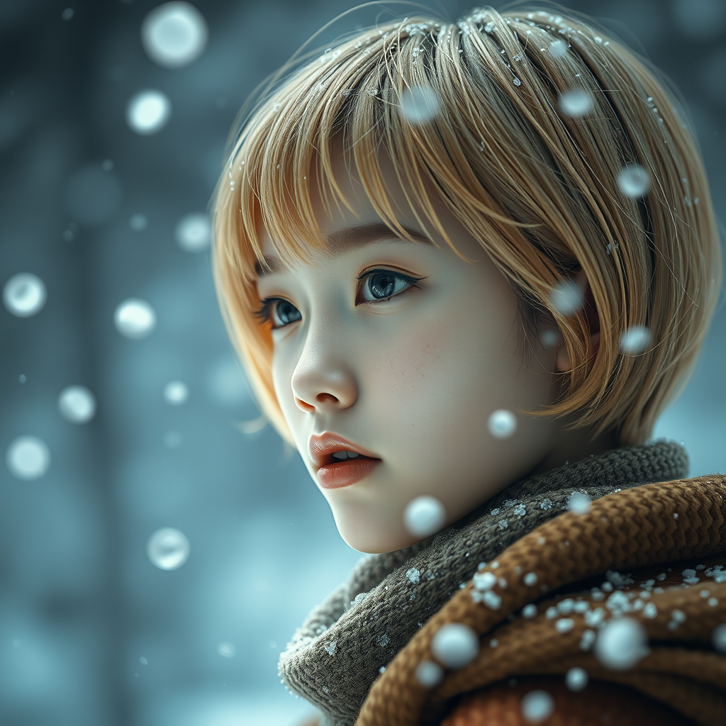 Ultra-detailed scene featuring a natural and realistic depiction of a girl with short blonde hair, capturing an Asian descent in a cinematic light amidst falling snow. The image is infused with a sense of exploration and adventure, reminiscent of a trendy piece on Artstation, and showcases an 8K resolution quality. Photographed with a 3.5mm camera lens, the artwork balances elements of both high and low resolution, intentionally introducing imperfections such as blurred spots, jpeg artifacts, and occasional lapses in anatomy with missing or extra digits. The composition may include slight cropping and an overlay of unexpected text or watermarks, creating a juxtaposition between high artistic intent and raw authenticity.