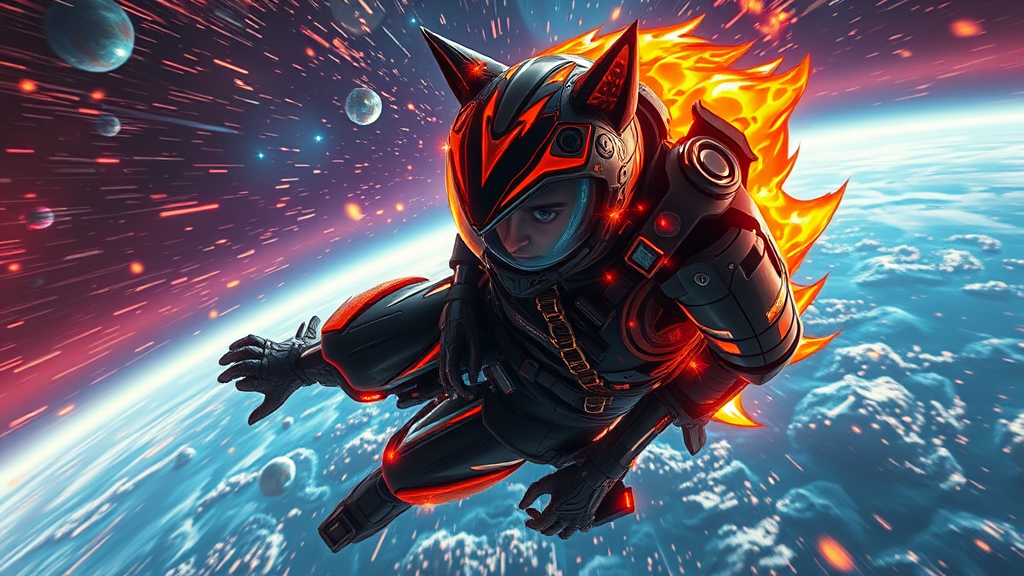 Cinematic film still professional 3D model anime artwork concept art masterpiece oil painting, comic Dreamscape with a futuristic pilot suit spiraling into the vast cosmos, space suit resembling a blend of science fiction and anime design. Surreal, ethereal, and dreamy with a mysterious fantasy vibe. Intensely detailed psychedelic artwork with vibrant colors, digital artwork that is both illustrative and painterly, with a matte painting feel. The pilot is visibly panicking, eyes wide in fear. Key visual emphasis with a vibrant octane render exhibiting dramatic volumetric lighting, glossy textures, and lens flare. The suit features a strikingly aggressive wolf-inspired helmet, engulfed in cosmic flames, and armor that balances black with fiery orange tones. Detailed shallow depth of field, vignette, high budget aesthetics with bokeh effects, cinemascope aspect, moody, epic, and gorgeous with film grain adding a textured touch.