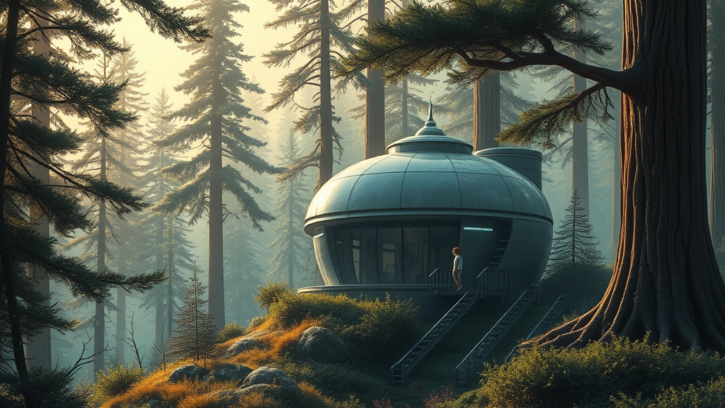 Imagine a magical, dreamy landscape in the style of Miyazaki, where a small, cute girl resides alone amidst the vastness of a futuristic, sci-fi wilderness. The scene is filled with ultimate detail, capturing every tiny, intricate element. Her home is a round, futuristic, multi-layered structure set high among colossal trees, resembling an intricate habitation cabin. The architecture blends seamlessly with nature, offering a unique and enchanting contrast. Soft, dramatic lighting casts a gentle glow over the landscape, enhancing the cinematic feel and adhering to the rule of thirds. The scene is imbued with a sense of wonder and exploration, as the girl wanders through a world that combines the mystical beauty of the natural environment with the sleek elegance of advanced technology, creating an awe-inspiring blend of the natural and the futuristic.