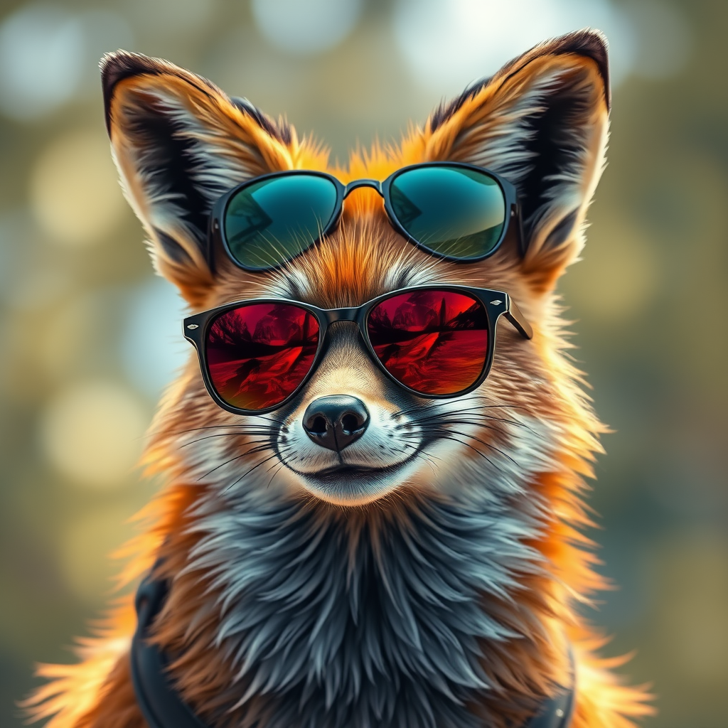Highly detailed matte painting showcasing a stylized three-quarters portrait of an anthropomorphic, rugged fox with a cheerful expression, sporting sleek sunglasses. The scene captures the essence of a head animal person, set against a beautifully blurred bokeh background, adding depth and a dreamy quality to the composition. The fox's fur is richly textured with warm, earthy tones, and the play of light and shadow enhances its lively features. The vibrant reflections in the sunglasses suggest a bright sunny day, subtly hinting at a dynamic world just beyond the frame.