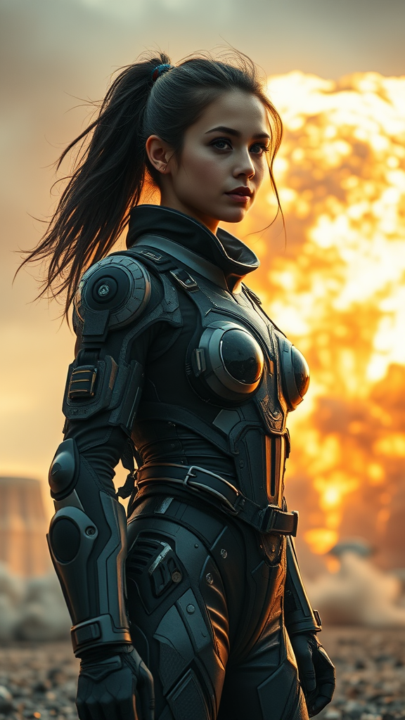 A full-body portrait of a young woman in a sleek, futuristic exo suit and intricate sci-fi armor, standing against the backdrop of a titanic nuclear explosion. The scene is bathed in the glow of the blast wave, with nuclear ash swirling through the air. The imagery captures the essence of atomic fission with intense, detailed textures. In a style reminiscent of ultra-high-definition movie stills, the image portrays a cinematic and futuristic atmosphere in 8K resolution. Emphasizing photorealism and hyper-realism, the depiction includes elements of acceleration, a blinding flash of light, and a sense of speed. Rendered in a painting-like quality, the composition uses complex lighting and cinematic staging from a third-person perspective, with a sense of motion akin to a long exposure photograph.