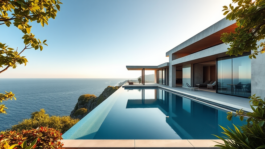 A striking hyper-realistic eye level exterior view of a mid-century modern house perched gracefully above the ocean, bathed in serene daylight with soft, indirect lighting. This architectural masterpiece, reminiscent of the timeless designs of Frank Lloyd Wright, Charles and Ray Eames, and Mies van der Rohe, features expansive glass walls that seamlessly blend indoor and outdoor spaces. The structure is adorned with warm natural wood and sleek concrete, creating a harmonious balance with the surrounding landscape. An elegant infinity pool mirrors the sky, adding a touch of tranquility to the scene, while lush greenery frames the property, enhancing its connection to nature. The overall image captures the essence of sophisticated simplicity and innovation featured in AD magazine.
