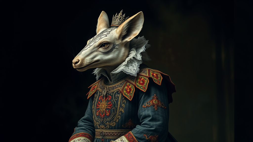 A regal anthropomorphic animal adorned in an elaborately embroidered medieval dress, intricately designed with inspiration from Peter Morbacher, Anthony Van Dyck, Aleksi Briclot, and Alexandre Cabanel. The creature stands against a somber, dark background, exuding a gothic atmosphere. The artwork is exceptionally detailed, reflecting concept art finesse, with slight creative adaptations that maintain the essence of the vision. The composition avoids common artistic pitfalls, presenting a balanced and captivating image.
