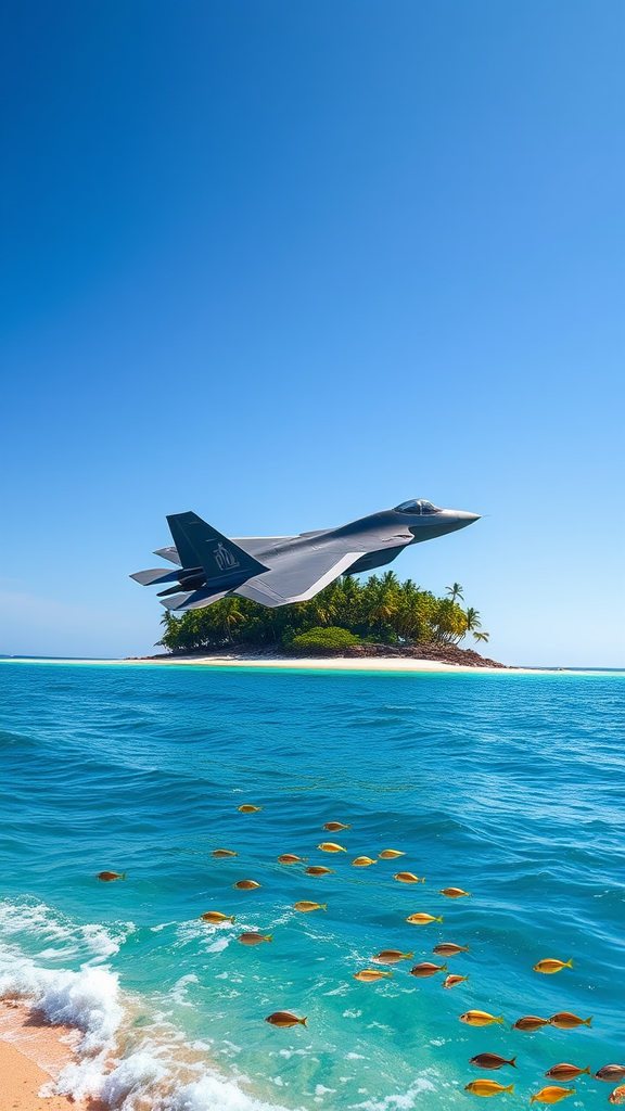 A sleek F-22 Raptor soars gracefully through the clear blue sky, casting a fleeting shadow over a lush tropical island. The island, dotted with vibrant green palm trees and surrounded by the shimmering turquoise of the ocean, provides a stunning backdrop to the jet's powerful and elegant gliding. Below, the gentle waves lap against the sandy shores, while a school of colorful fish dart playfully in the waters, oblivious to the aerial marvel overhead.