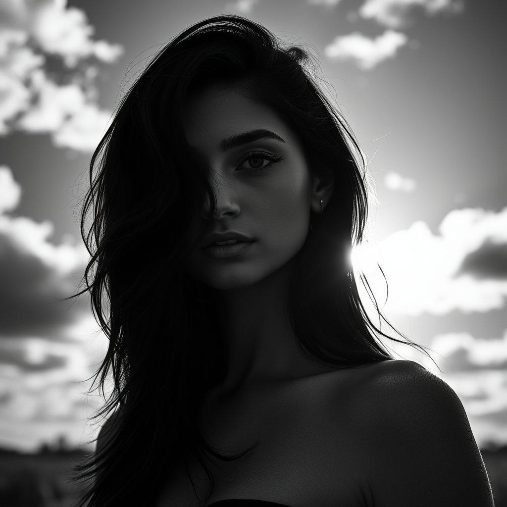 A striking black and white photograph capturing a stunning dark-haired woman in a natural setting, enveloped by a dramatic sky. The interplay of light and shadow highlights her features, adding depth and mystery. The scene is captured in high resolution with a cinematic angle, emphasizing dynamic backlighting that enhances the mood of a professional fashion editorial, resulting in a realistic and captivating portrait.