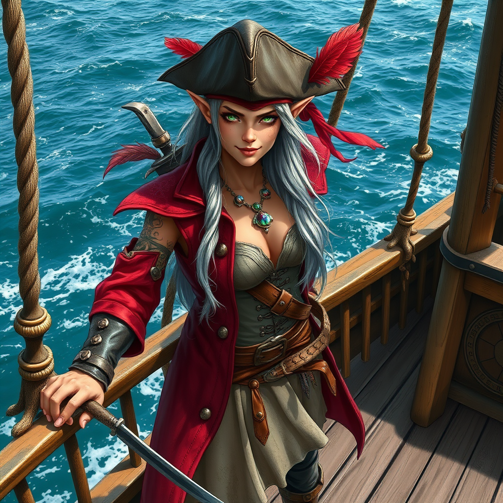 A fierce female elf pirate stands confidently on the deck of a weathered ship, her emerald green eyes glinting with determination. Her long, silver hair cascades down her back, slightly tousled by the ocean breeze. She wears a worn leather tricorn hat adorned with a single crimson feather, matching her intricately embroidered crimson coat that billows in the wind. Underneath, she sports a rugged, sleeveless tunic, revealing her toned arms adorned with various tribal tattoos. Her ears are pointed, a telltale sign of her elven heritage. A jeweled cutlass gleams at her side, and a pair of knee-high boots anchors her firmly to the wooden planks. Around her neck clinks a necklace of tiny seashells, and a mischievous smile plays on her lips as her free hand grips the ship's wooden railing, ready to navigate through the next adventure. The vivid, teeming sea serves as her backdrop, reflecting her wild and untamed spirit.