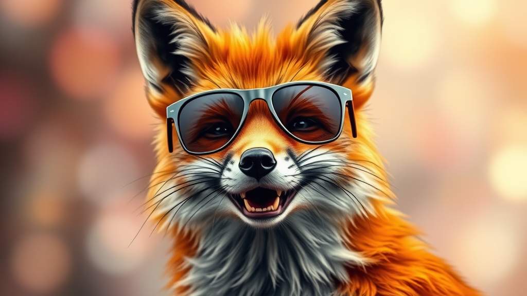 Vibrant and intricately detailed portrait of a charismatic anthropomorphic fox with a weathered, joyful expression, sporting stylish sunglasses. The fox's fur is a rich blend of warm tones, adding to its lively personality. The background is a softly blurred bokeh, enhancing the subject's prominence in the matte painting. The composition is three-quarters, capturing the essence of this lively character, set against a dreamy, abstract play of colors and light.