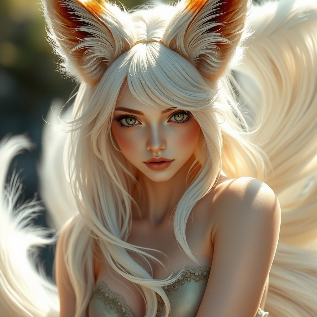 A hyper-realistic depiction of a nine-tailed fox girl with a touch of ethereal beauty, capturing the essence of fantasy and realism. Her silky, cascading hair shines in soft natural lighting, accentuating the delicate, intricate details of her fox-like features. Each of her nine lush, fluffy tails swirl gracefully around her, casting subtle shadows on her elegant form. Her piercing, enchanting eyes hold a mysterious allure, drawing the viewer into her enchanting world. The overall composition is akin to a professional, high-resolution 8k photograph, exuding a serene and captivating ambiance inspired by the artistic styles of Wlop and Guweiz.