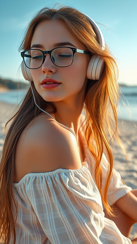 A stunning young woman with glasses gazes thoughtfully into the distance as she sits on a serene beach, eyes gently closed, lost in the rhythm of her favorite music. Her headphones rest comfortably over her ears, complementing her flowing long hair. She exudes a soft and graceful aura, enhanced by her angelic, symmetrical features. Captured in a reverse angle, the full-body portrait reveals her tranquility amidst the natural surroundings. The scene is filled with intricate detail, vibrant and glowing colors, set in natural lighting that amplifies her gentle beauty. The composition employs a wide angle and depth of field, highlighting the breathtaking landscape. Every element, down to the smallest detail, is meticulously rendered, resulting in an image of the highest quality, reminiscent of RTX ray-tracing lighting effects, with an ultra-realistic, crisp 16k finish.